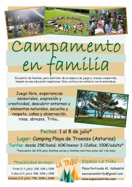Campamento en familia. Camping Playa de Troenzo, Llanes (Asturias).Encuentro de familia para disfrutar de un espacio de juego y crianza compartida. Organiza Espacio La Tribu. Actividad familiar Inscripción previa Venta anticipada 3-12 Dónde Camping Playa de Troenzo, Llanes (Asturias). Precio Desde 100€ por adulto. Contacto