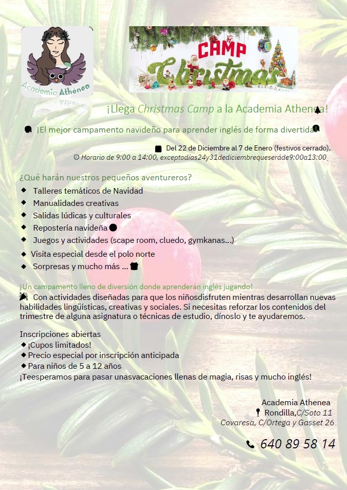 "Christmas Camp". Academia Athenea, Valladolid.Talleres temáticos. Manualidades creativas. Salidas lúdicas y culturales. Repostería navideña. Juegos y actividades (scape room, cluedo, gymkanas,...).Edad: 5-12. Actividad para niños Inscripción previa Dónde C/ Ortega y Gasset, n.26. (Covaresa). Valladolid. C/ Soto, n.11. (Rondilla). Valladolid. Contacto Tel . 640 89 58 14.