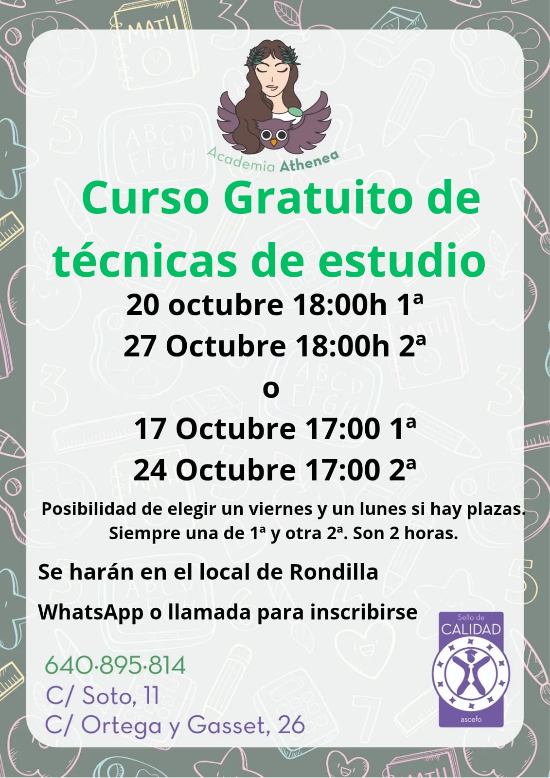 Curso gratuito de Técnicas de Estudio. Academia Athenea, Valladolid. Actividad para niños Inscripción previa Dónde C/ Soto, n.11. (Rondilla). Valladolid. Contacto Tel . 640 89 58 14.