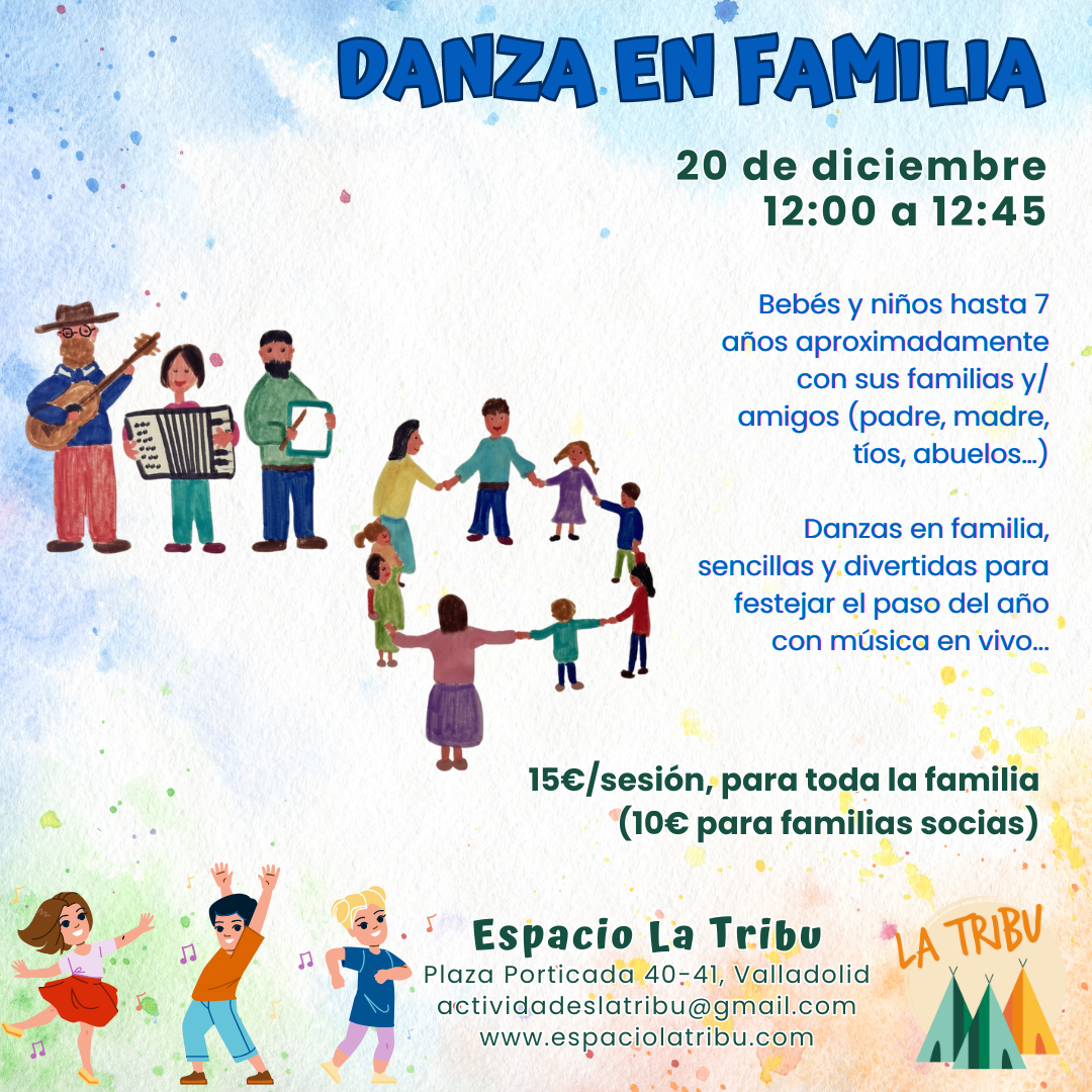 Danza en Familia. Espacio La Tribu, Valladolid.Danzas en familia, sencillas y divertidas para festejar el paso del año, con música en vivo. Son bienvenidos abuelos y tíos. Actividad familiar 0-7 Dónde Espacio La Tribu,Plaza Porticada 41. Valladolid. Valladolid Precio 15€ por familia.