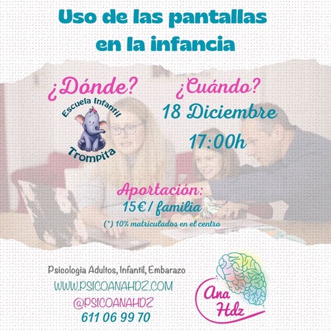 Escuela de Padres "Las pantallas en la infancia". Escuela Infantil Trompita, Arroyo de la Encomienda (Valladolid). Inscripción previa Dónde Escuela Infantil Trompita, C/ Severo Ochoa, nº4. Arroyo de la Encomienda (Valladolid). Contacto 611 069 970. www.psicoanahdz.com