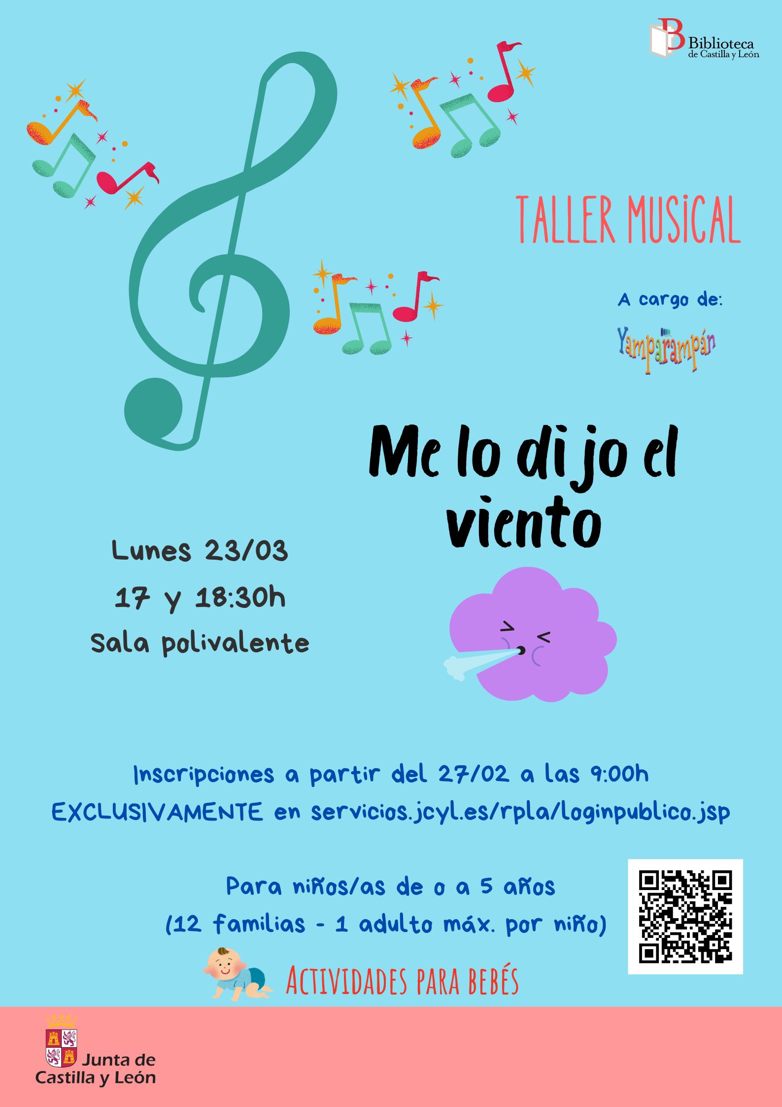 Taller musical "Me lo dijo el viento". Biblioteca Pública de Castilla y León.A cargo de: Yamparampán. Niños acompañados Inscripción previa Dónde Biblioteca Pública de Castilla y León. Valladolid.